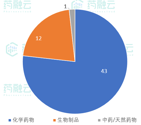 - 从药品类型来看,化学药物共计43项,生物制品12项,中药/天然药物1项