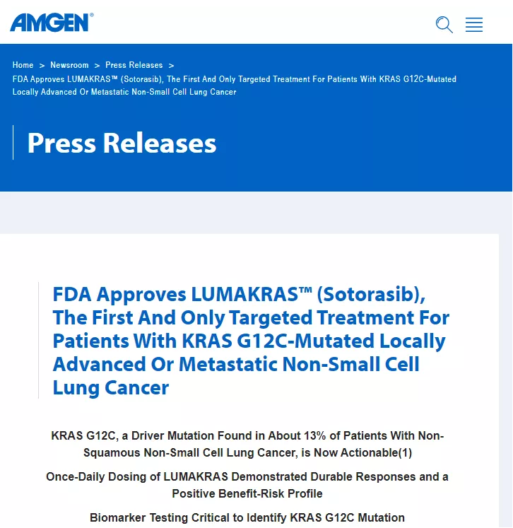 FDA 批准安进 LUMAKRAS™(Sotorasib)上市,这是第一个也是唯一一个针对KRAS G12C 突变的局部晚期或转移性非小细胞肺癌患者的靶向治疗药。Sotorasib也就是知名的AMG 510。