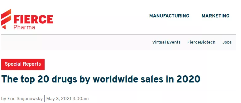 近期FiercePharma发布专题报道,2020年全球销售额Top20药物。其中8款药物为单抗药物,3款为融合蛋白,1款为疫苗,化药仅剩8席。