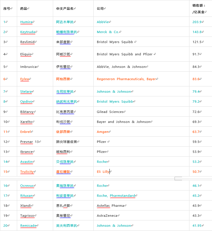 2020年全球销售额Top20药物