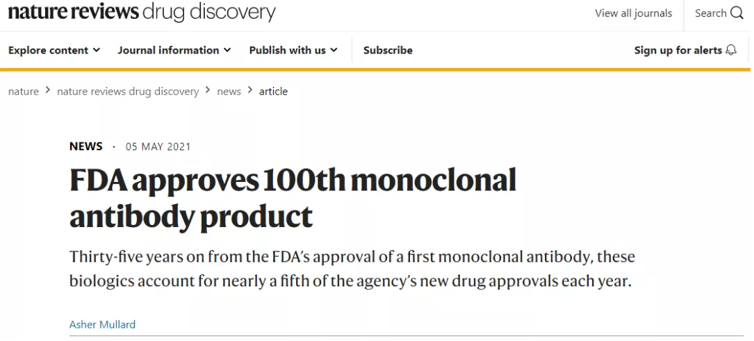 5月初,Nature reviews drug discovery新闻,美国FDA批准第100个单克隆抗体。从FDA批准第一批单克隆抗体起,已有35年的历史,这些生物制剂每年占FDA批准新药的近五分之一。