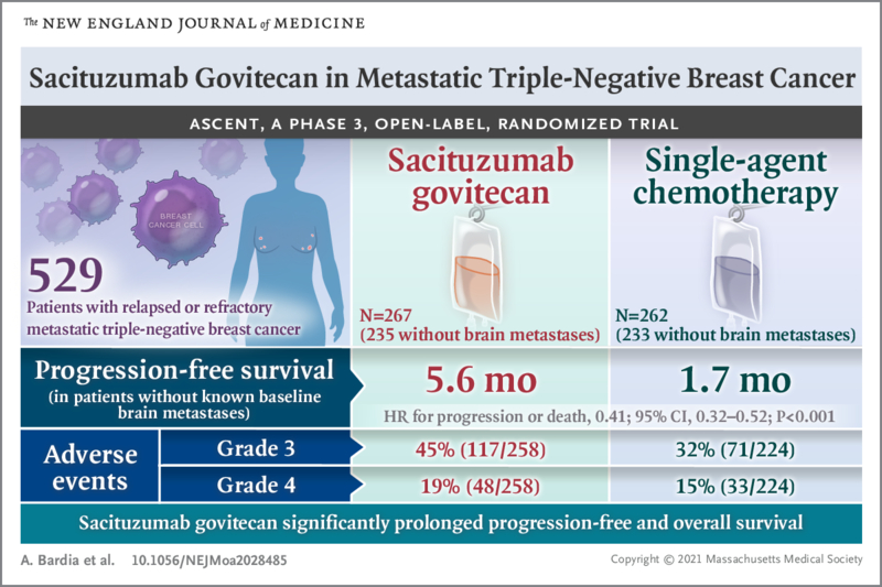 sacituzumab govitecan(戈沙妥组单抗)是一款 First in class 抗 Trop2 抗体药物偶联物(ADC),是 Immunomedics 公司的核心产品,吉利德在 2020 年 9 月以 210 亿美元大手笔收购 Immunomedics 获得了该产品,将其带上行业内热议的风口浪尖。该药于2020年4月22日获得美国FDA批准上市,商品名为Trodelvy®,用于转移性三阴乳腺癌的治疗。在顶级期刊NEJM上发表的一项III期临床研究中,抗体偶联药物Sacituzumab Govitecan(SG),让复发或难治性三阴乳腺癌患者的中位无进展生存期达到了5.6个月,相比传统疗法的1.7个月足足提高了两倍多。