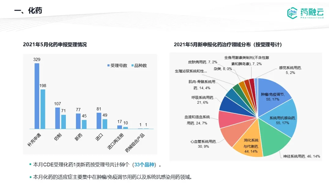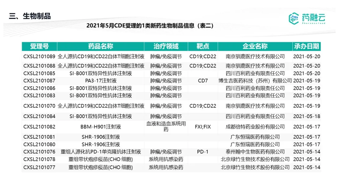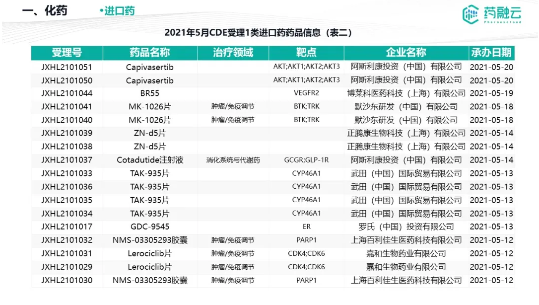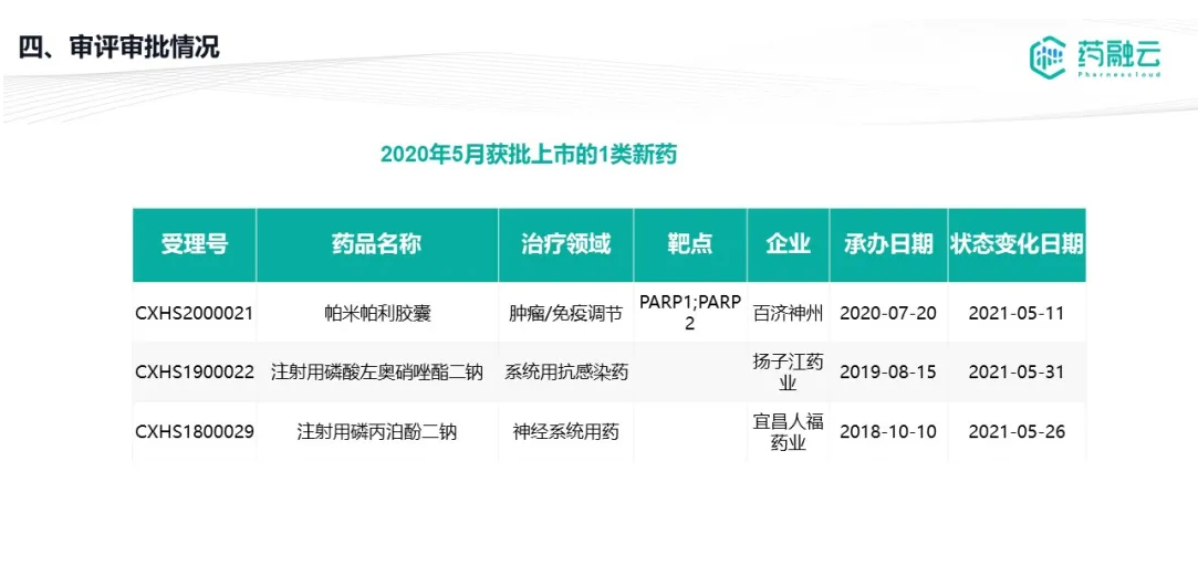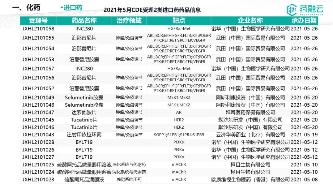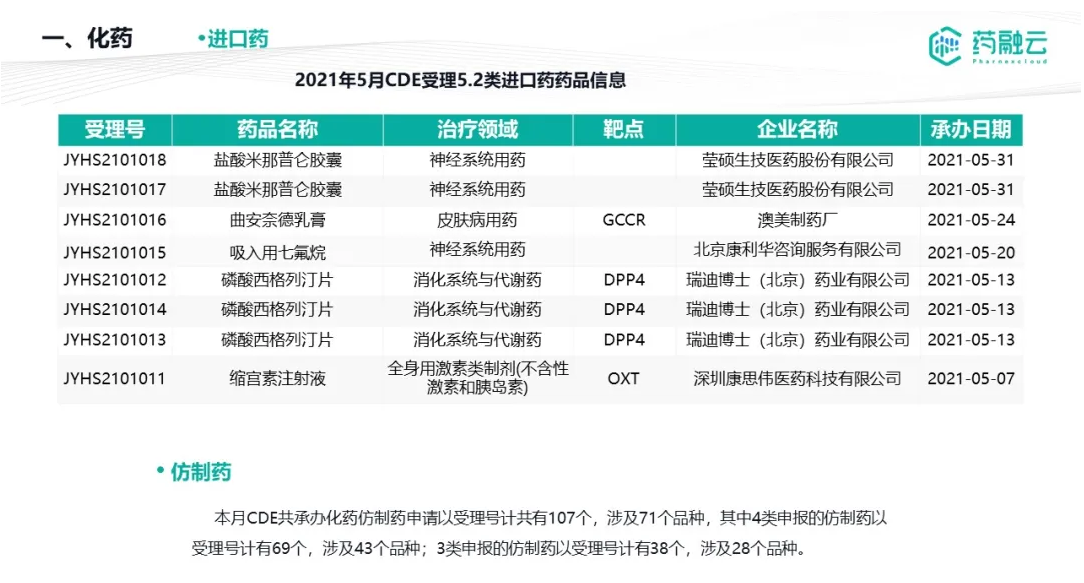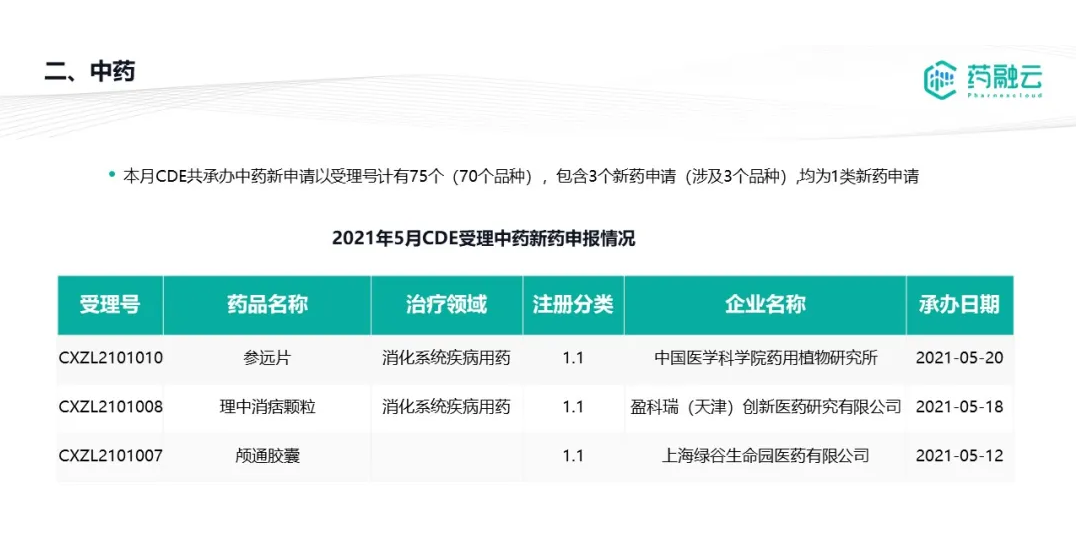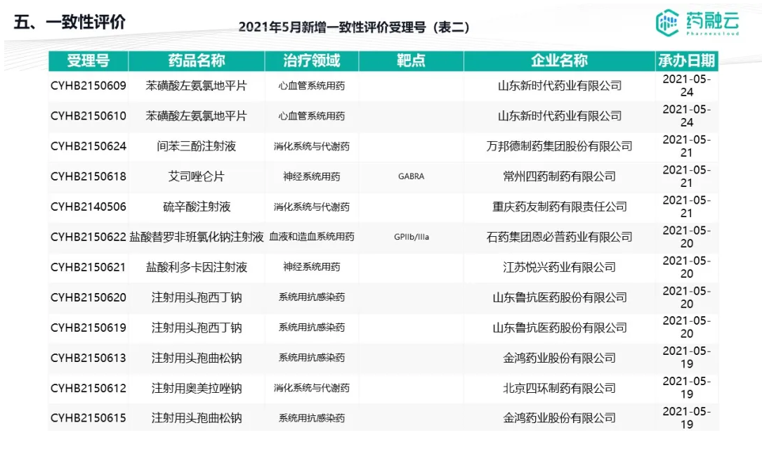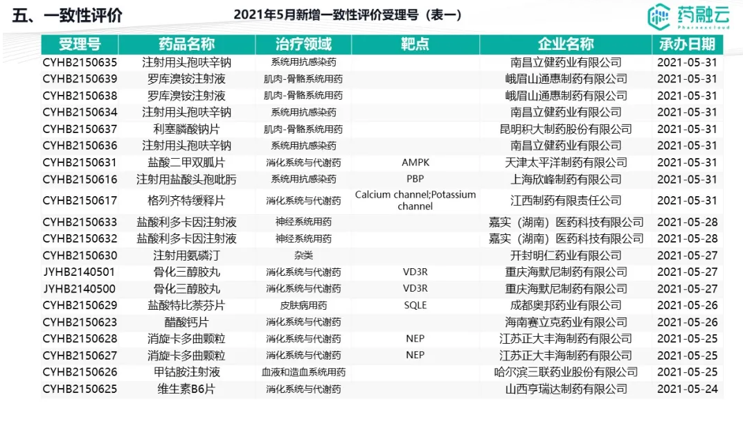 数据统计时间段为2021年5月1日-2021年5月31日,药融云将定期公示CDE承办药物审评审批进度及一致性评价过评信息,关注公众号“药融云”即可定期查看。如有疏漏,欢迎指正!