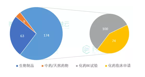 从药品类型来看,生物制品63项,中药/天然药物9项,化学药物共计174项,占试验总数的71%,其中包括BE试验100项。