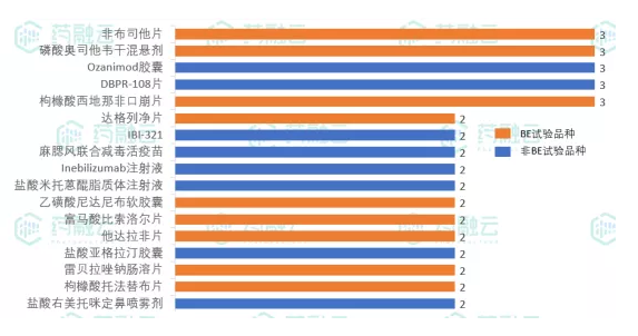 CDE新公示的临床试验药物品种中,共有17个登记试验数≥2的药物品种,半数以上为BE试验品种,非布他司片、磷酸奥司他韦干混悬剂等以3个登记试验位居前列。