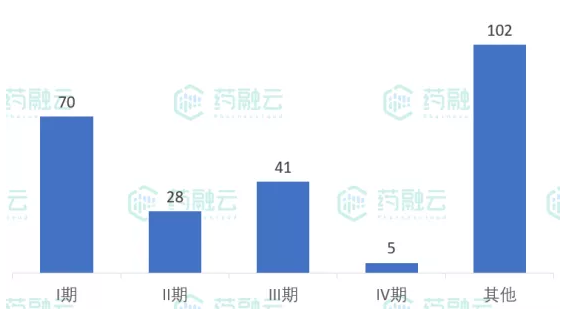 从临床分期来看,临床I期70项,临床II期28项(含I/II期),临床III期41项(含II/III期、I/II/III期), 临床IV期5项,其他试验102项(主要是BE试验)。
