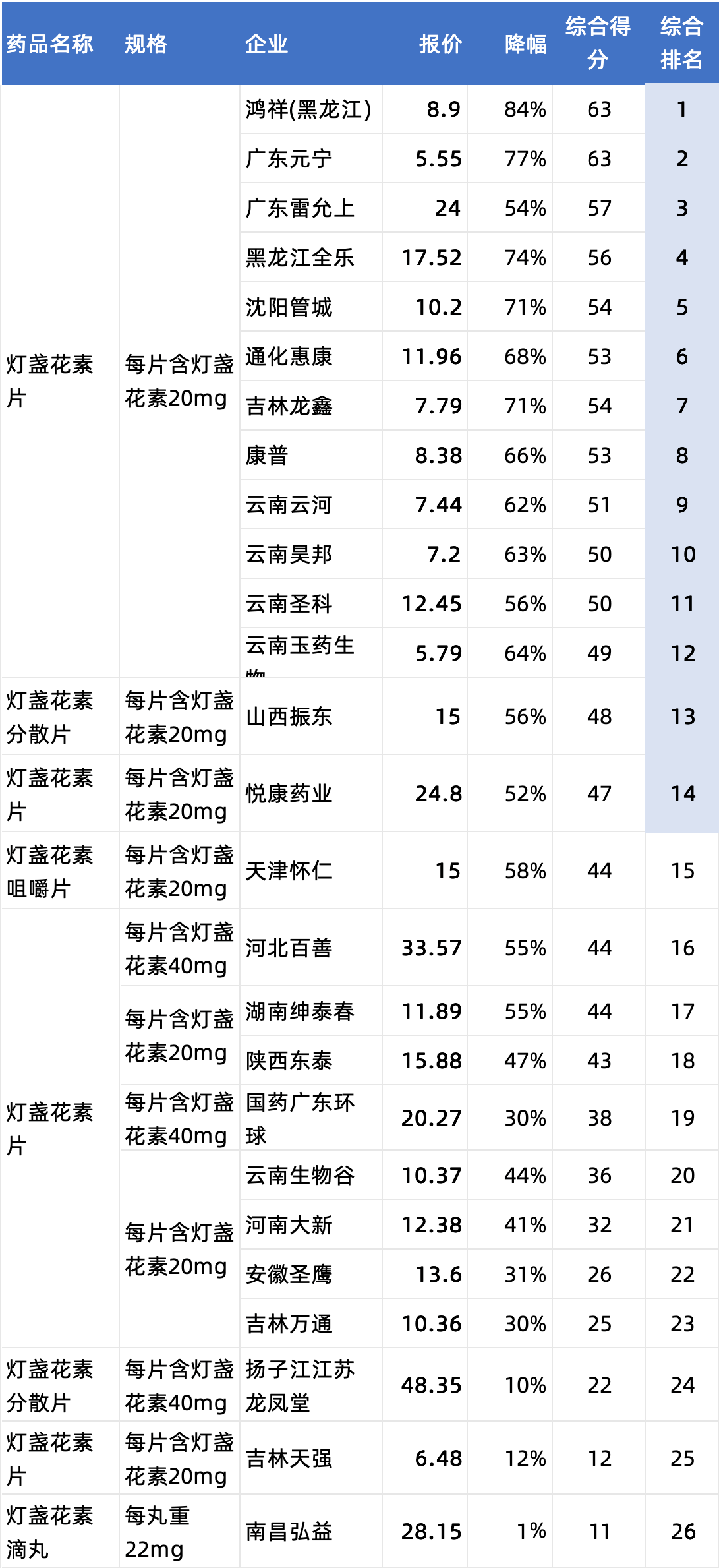 B单元有26个有效报名企业,入围14家。降幅最高的是黑龙江的鸿翔,24片装报价8.9元,降84%,综合排名第一。入围的14个企业都符合直接拟中选条件。综合排名末位的南昌弘益,基本没有竞价,但因为有中药保护身份,可以通过复活机会中选。