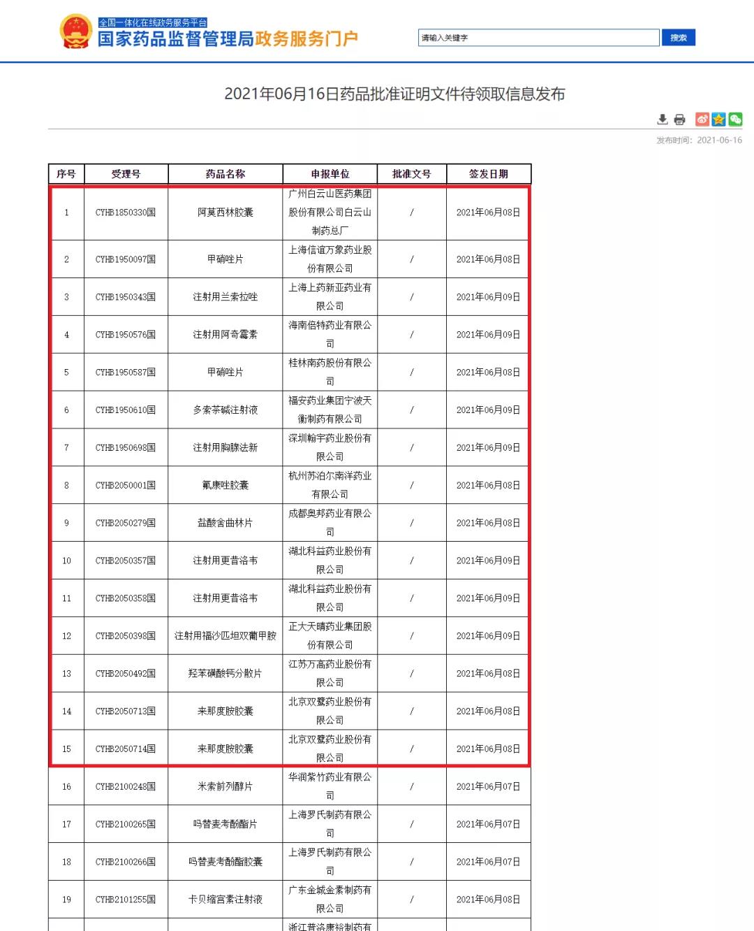 2021年06月16日,国家药监局发布52个药品批准证明文件待领取信息,其中15个通过一致性评价,包括1个首家品种。