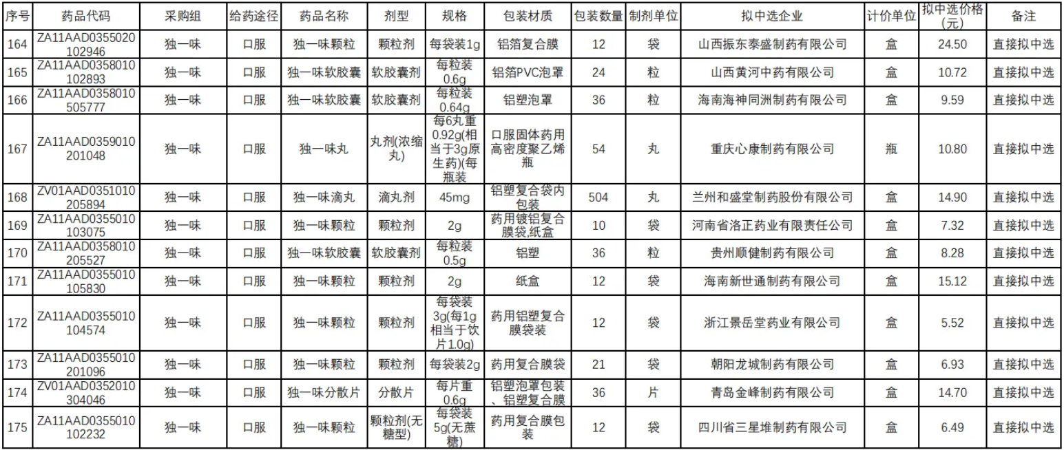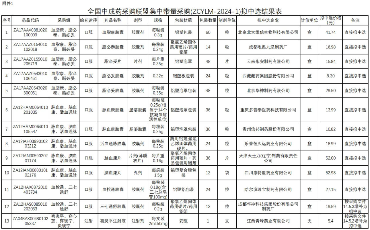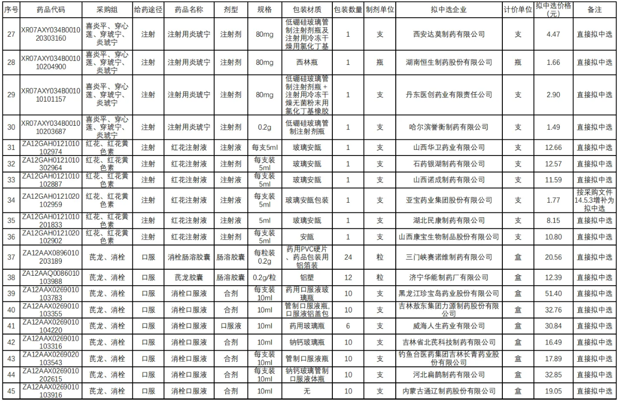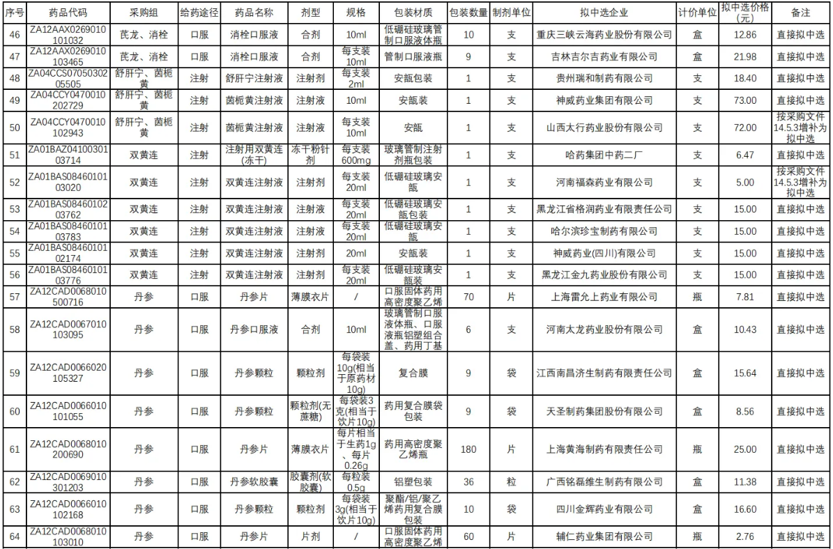 在独家品种方面,江西青峰药业的喜炎平注射液尤为引人瞩目。其拟中选价格仅为5.4元,相较于此前湖北省医保局公示的最低挂网价21.5元、省际联盟集采价19.6元以及基准价21.5元,实现了75%的大幅降价。值得注意的是,喜炎平作为增补中选品种,其在2023年全国院内市场的销售额超20亿元。该品种需满足技术评价满分或为国家中药保护品种(有效期内)的条件,并接受同组内降幅排名前70%的最低降幅。