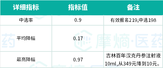 平均中选率是90%,平均降幅17%,但最高降幅也有97%,来自吉林百年汉克丹参注射液10ml,从349元降到10元。