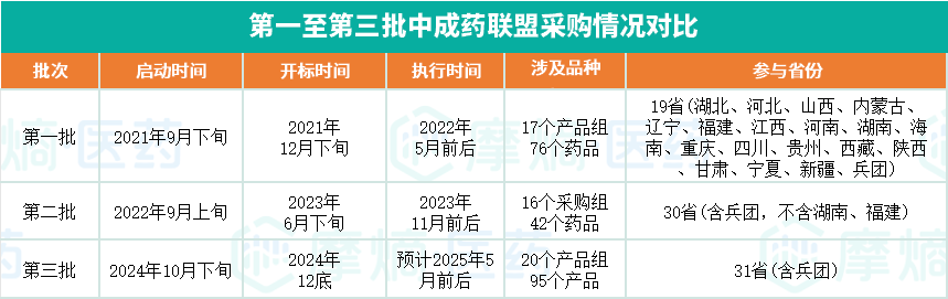 湖北主导的三轮中成药集中采购活动,不仅覆盖的品种日益丰富,参与的省份范围也持续扩大。具体而言,参与省份由首批的19省扩展至第二批的30省,直至第三批的全国31省;涉及的药品品种则由首批的17个产品组共计76种药品,调整为第二批的16个采购组42种药品,再到第三批的20个产品组涵盖95种产品。