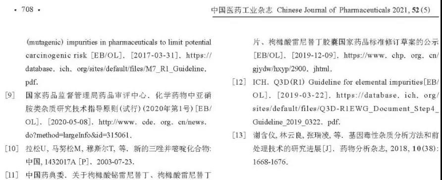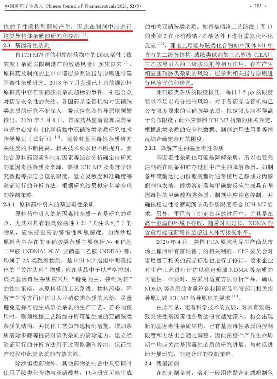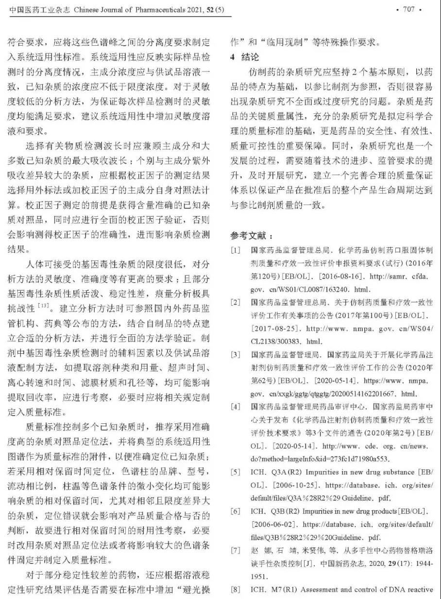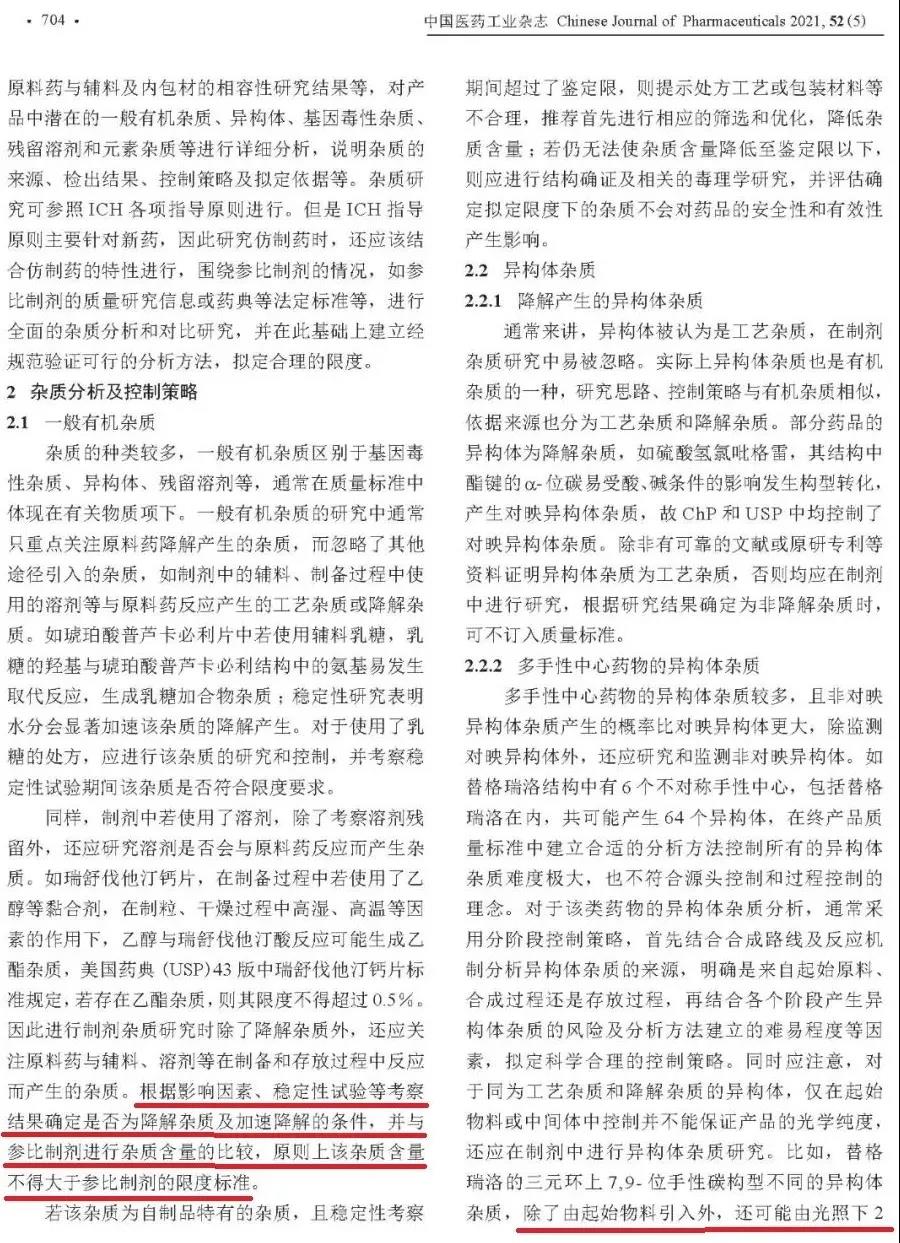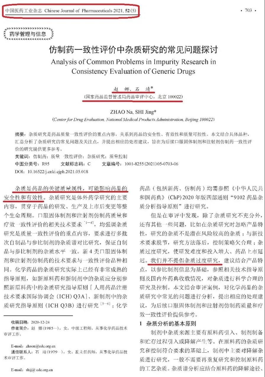 《中国医药工业杂志》2021年第5期刊登了、由国家药品审评中心(CDE)赵娜和石靖两位老师撰写的“仿制药一致性评价中杂质研究的常见问题探讨”一文(文章详见文末图1-6)。又是一篇“集大成”的杂质研究文章,且由于是“裁判员”所著,故备受瞩目。本人打印出纸制版阅读数遍,深感CDE倡导的杂质研究已到无以复加程度,是时候“做减法”了。撷取10处点评,以飨众人。