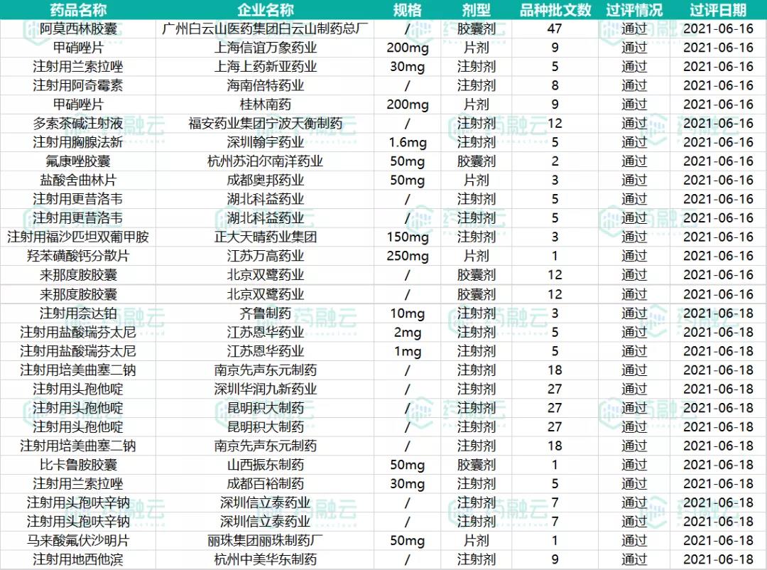 数据统计时间段为2021年6月12日-2021年6月18日,药融云将定期公示一致性评价过评信息,关注公众号即可定期查看。如有疏漏,欢迎指正!