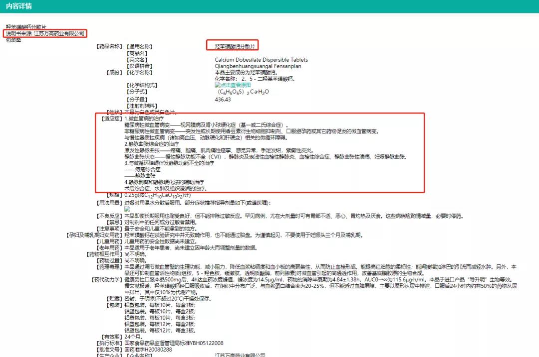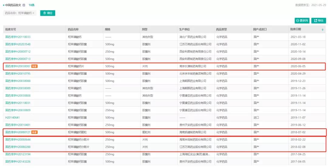 图3:“羟苯磺酸钙”的批文信息