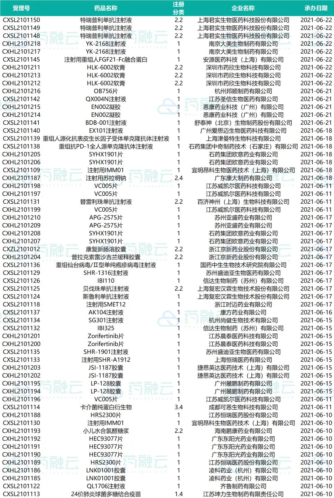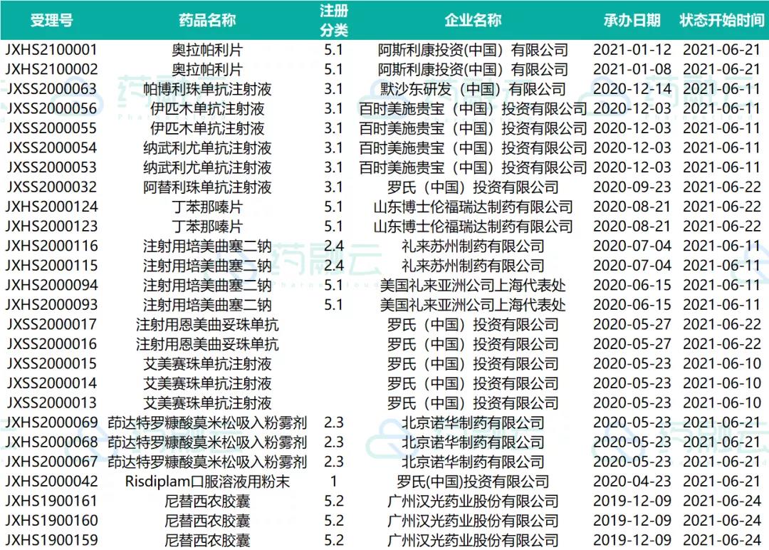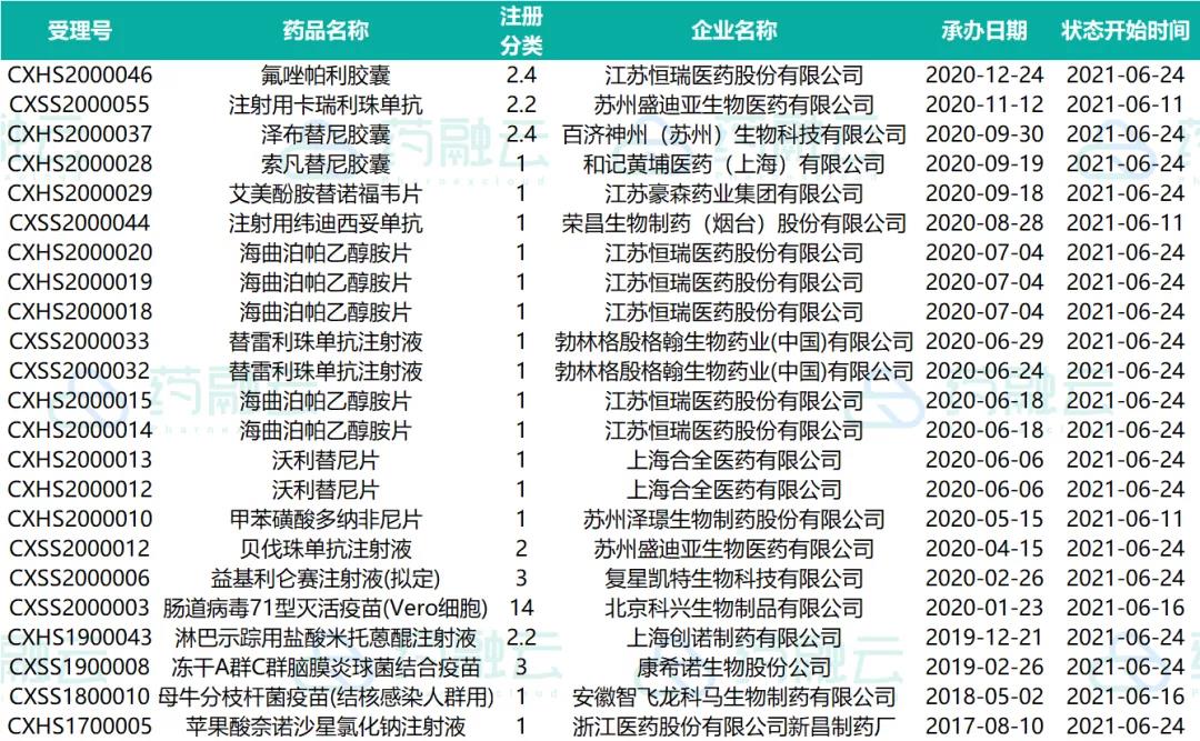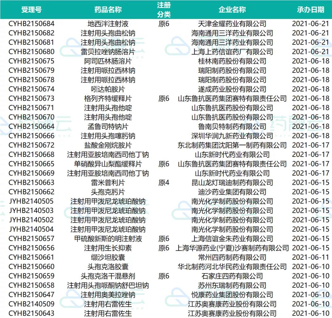 数据统计时间段为2021年6月10日-2021年6月24日,药融云将定期公示药品审评信息,关注公众号即可定期查看。如有疏漏,欢迎指正!