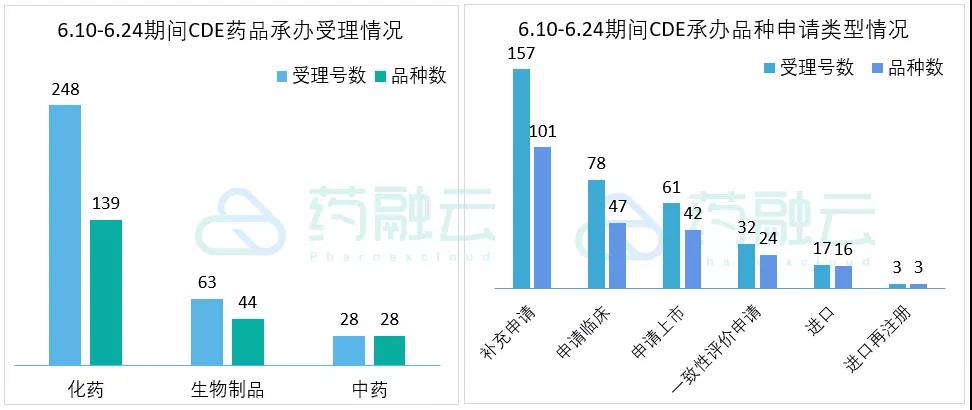 根据药融云中国药品审评数据,6月10号-6月24号期间共220个(按品种计,下同)药品获CDE承办,包括化药139个,生物制品44个,以及中药28个。