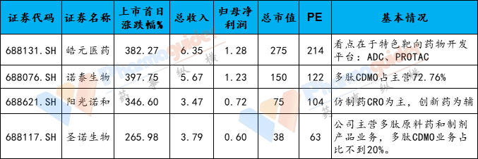 高估值激发了同类企业的上市热情。近一个月,诺泰生物、圣诺生物、皓元股份、阳光诺和,四箭连发登陆了科创板,摘取了盛夏的果实。还有7家公司已经提交了IPO招股书,正在上车的路上。我们先看看资本市场如何款待新上市的四家公司。