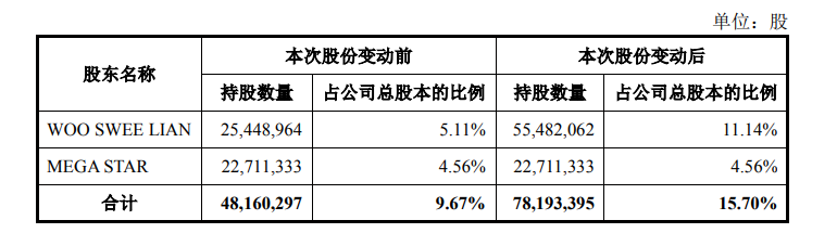 完成转让后,胡瑞连先生将直接持有公司55,482,062股股份,持股比例为 11.14%;通过MEGA STAR 间接持有公司 22,711,333 股股份,持股比例为4.56%。胡瑞连先生合计持有公司78,193,395 股股份,持股比例为15.70%。同时,公司董事会由 6 名董事(包含 3 名独立董事)组成,全部董事会成员均由胡瑞连先生控制的MEGA STAR提名选举产生。上述股权转让完成后,胡瑞连先生将变更为公司控股股东、实际控制人。