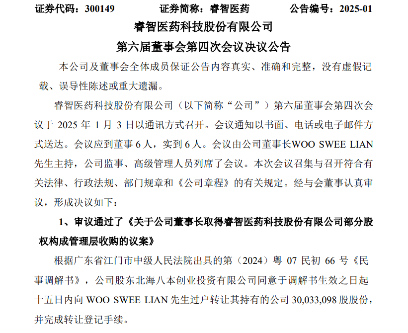 根据报告,经广东省江门市中级法院主持调解,北海八本创业投资有限公司(简称八本投资)与公司董事长WOO SWEE LIAN(胡瑞连)达成调解协议。根据调解书,八本投资同意向胡瑞连过户转让睿智医药3003.31万股股份。