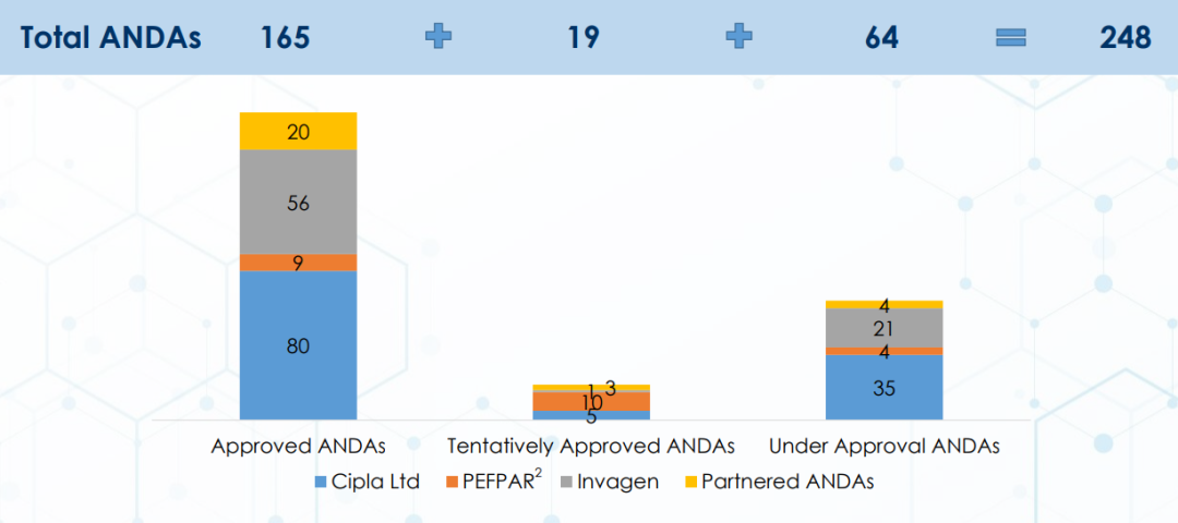 2020-2021财年,Cipla新药申请审批达248个,其中已经批准的165个,暂时性获批(TA)的19个,正在审批的有64个。