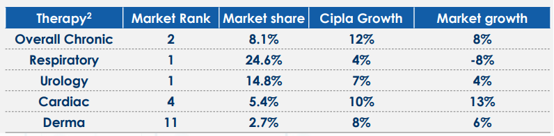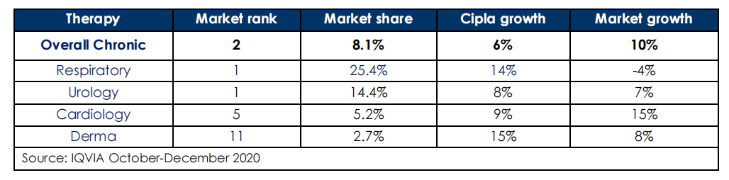 根据IQVIA,2020年10月-12月数据,在呼吸系统用药市场上实现了14%的增长,以25.4%的市场分占据第一;泌尿科治疗用药增长8%,以14.4%的市场份额占据第一。Cipla在慢性疾病疗法中增长了6%,以8.1%的市场份额排名第二。