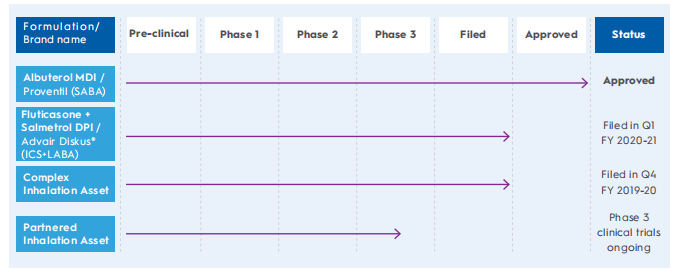 不仅如此,公司还在继续满足患者对呼吸产品的需求,提供布地奈德吸入制剂,并于2020年4月推出沙丁胺醇吸入制剂。通过沙丁胺醇产品,Cipla成为第一家在美国获得计量吸入器(MDI)批准的印度制药公司,展示了其在提供基于药物装置(药械组合)的产品方面的优势。这进一步增强了Cipla在美国的全球呼吸系统药物地位。