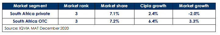 2020年,Cipla在全球市场的服务需求、投资组合的持续扩张以及制造业和供应链基础设施的表现强劲有力。Cipla在印度仿制药市场排名第三(截止IQVIA 的2020年12月20日数据),印度市场的COVID-19相关产品组合贡献了不少业绩。在美国,沙丁胺醇的市场份额在持续扩大。在南非制药市场排名第三截止IQVIA 的2020年12月20日数据)。