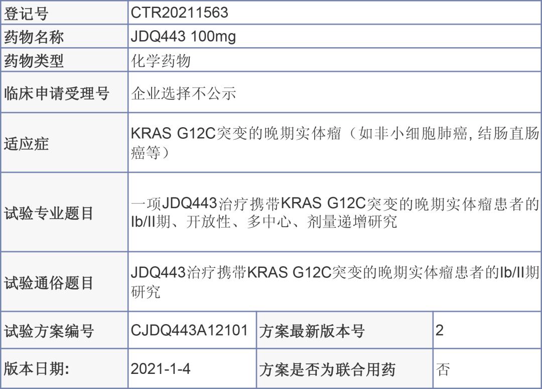 这项FIH研究的目的是在携带KRAS G12C突变的实体瘤成人患者中考察JDQ443单药的安全性、耐受性、PK、药效学(PD)和抗肿瘤活性。