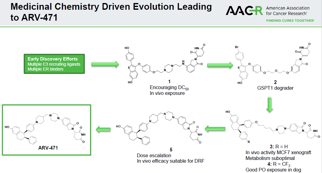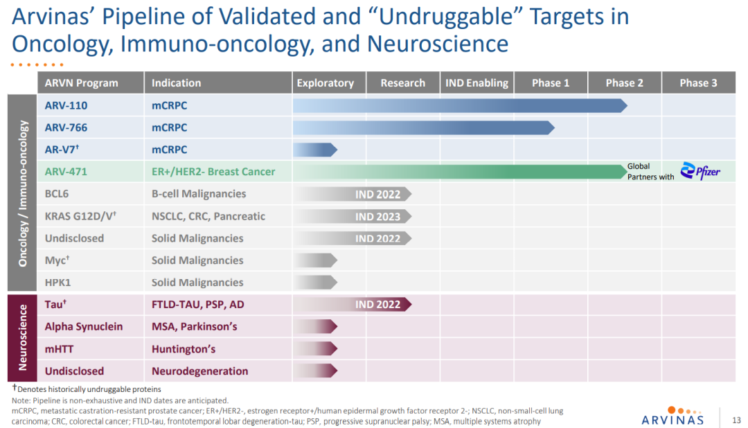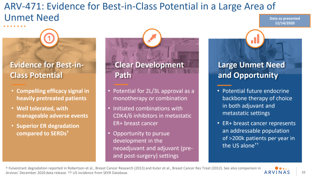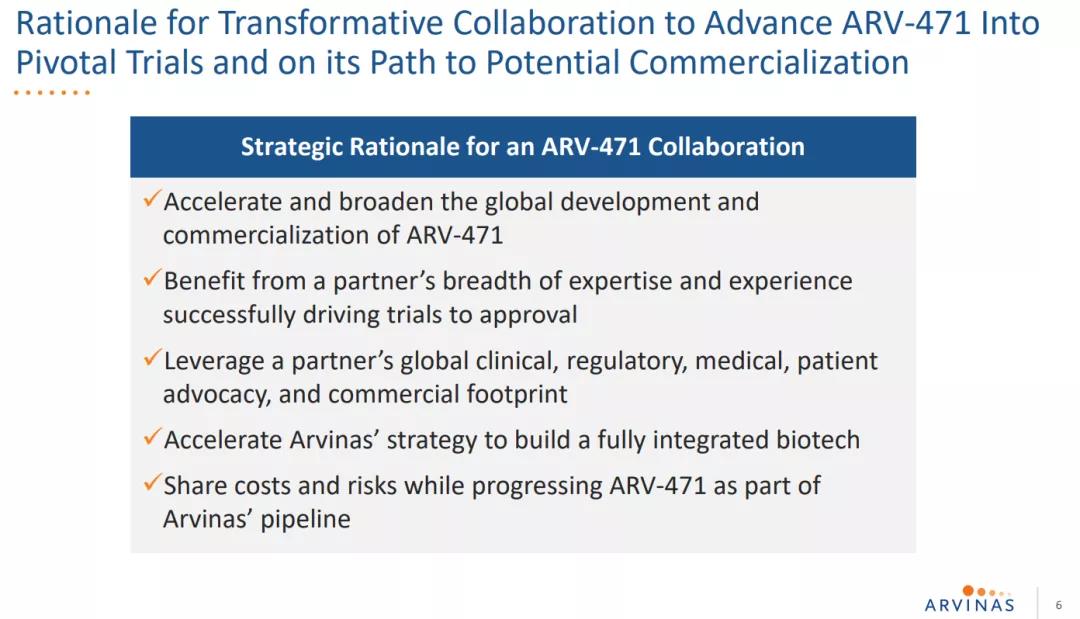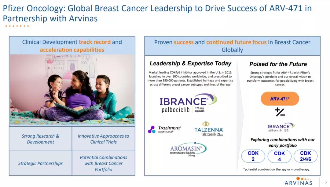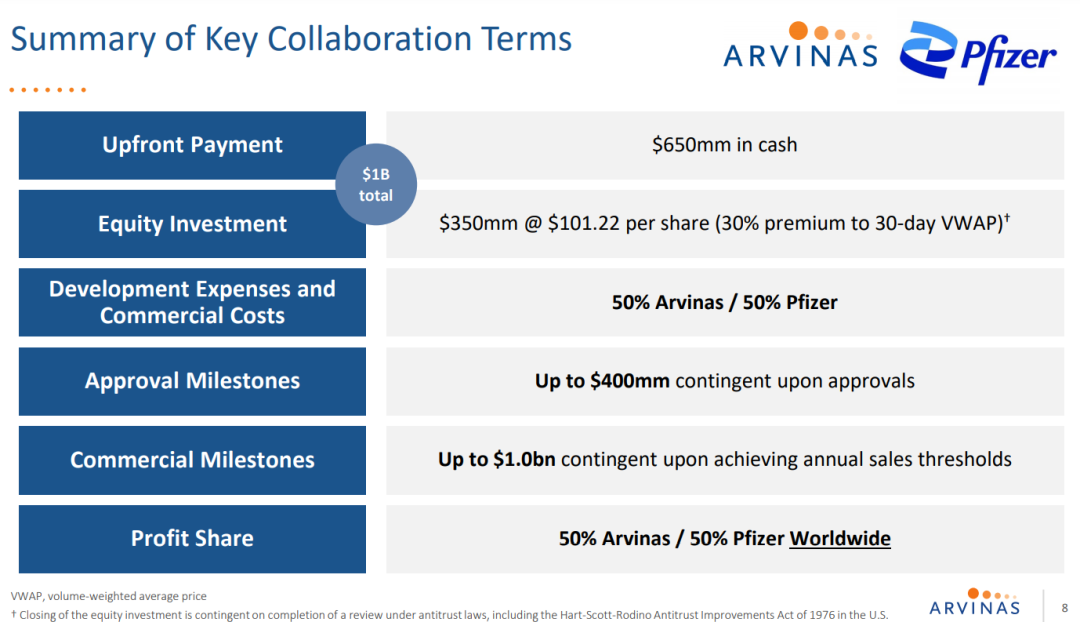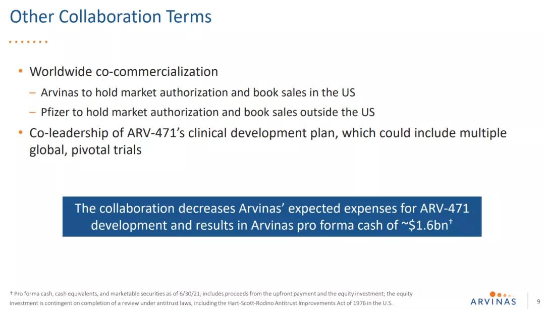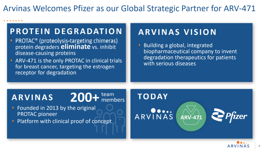 2021年7月22日,辉瑞与Arvinas达成一项可能价值超过 20 亿美元的合作,以开发 Arvinas 的候选口服 PROTAC 雌激素受体 (ER) 蛋白降解剂新药 ARV-471。。根据协议条款,Arvinas将获得6.5亿美元的首付款,此外可能最多达14亿美元的里程碑付款。两家公司将以50:50平均分担ARV-471全球开发成本、商业化费用和利润。另外,辉瑞将对Arvinas进行3.5亿美元的股权投资。