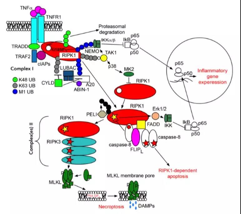 ▲响应于TNF-α的RIPK1依赖性信号传导事件的示意图