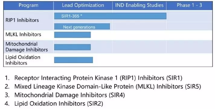 2021年7月8日,维泰瑞隆(Sironax)在国内递交受体相互作用蛋白 1(RIP1)激酶抑制剂(或称RIPK1抑制剂)SIR1-365临床试验IND。SIR1-365主要针对退行性疾病和炎症性疾病,海外已经在澳洲与美国开展多项临床试验;本品相关专利WO2020103859已经披露。下一代RIPK1抑制剂同样在研发中。