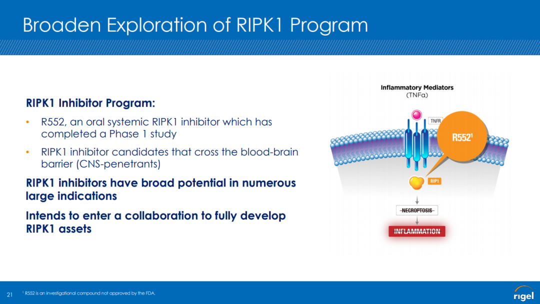 就本靶点领域而言,此前较大的合作交易有:2021年2月18日,礼来宣布与Rigel Pharmaceuticals公司签订一项全球独家许可和战略合作协议,两家公司将共同开发RIPK1抑制剂R552,用于包括自体免疫和炎性疾病在内的所有适应症,并将负责该疗法在包括自身免疫性疾病和炎症性疾病等所有适应症的商业化工作。