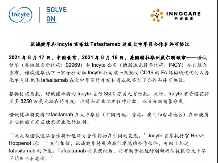 8月17日,诺诚健华和Incyte公司联合宣布,诺诚健华旗下一家子公司和Incyte公司就一款靶向CD19的Fc结构域优化的人源化单克隆抗体tafasitamab在大中华区的开发和商业化签订了合作和许可协议。