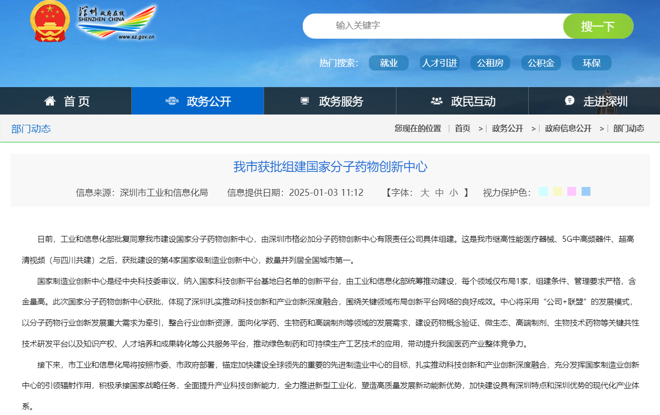 1月初,深圳工业和信息化部批复同意建设国家分子药物创新中心,由深圳市格必加分子药物创新中心有限责任公司具体组建,是分子药物领域全国唯一的国家制造业创新中心。
