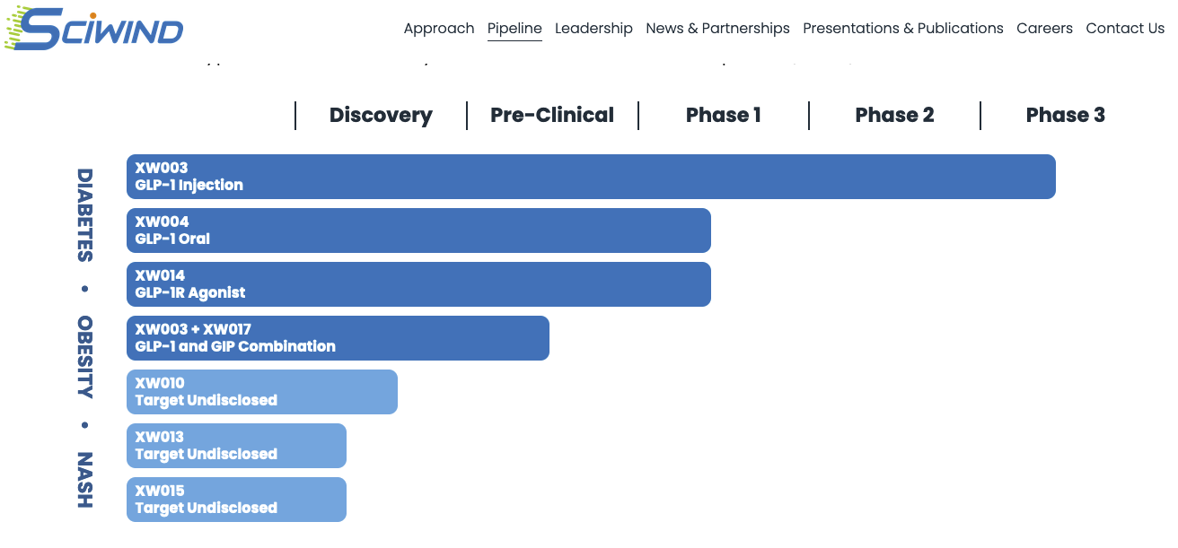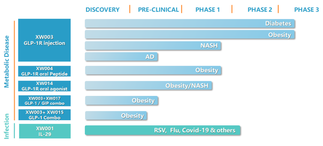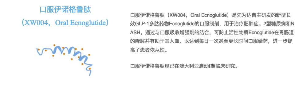 来自中国的先为达生物是一家处于拟商业化产业化阶段、专注于研究和开发治疗代谢性疾病的创新疗法的生物制药公司,研发管线包括同类首创和最佳候选药物:长效GLP-1多肽伊诺格鲁肽注射液(上市申请阶段)、口服GLP-1多肽伊诺格鲁肽片剂XW004(临床Ⅰ期)和口服小分子GLP-1受体激动剂XW014(临床Ⅰ期)等。