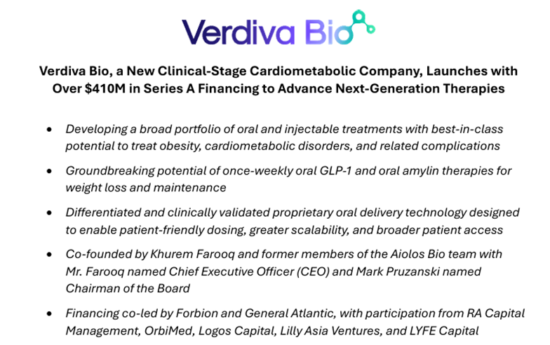 Verdiva Bio Limited是一家处在临床阶段的全球生物制药公司,致力于开发针对肥胖及其并发症,以及其他心血管代谢紊乱的下一代创新疗法,通过为人们提供更友好的治疗选择来实现更好的结果。2025年1月,Verdiva完成4.11亿美元A轮融资,由Forbion和General Atlantic共同领投,RA capital、OrbiMed、Logos Capital、礼来亚洲基金、LYFE Capital等跟投。(后面两家中国背景基金)