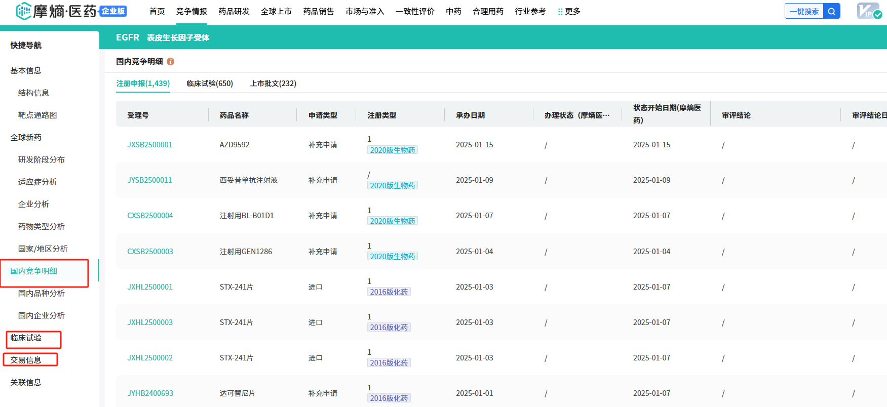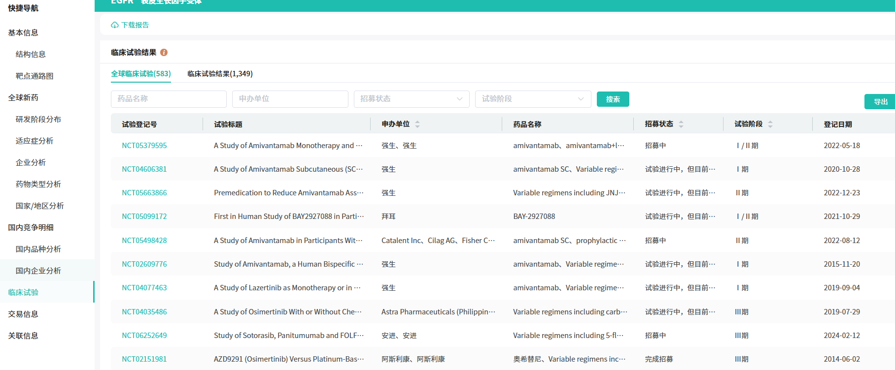 靶点详情页新增了“国内竞争明细”“临床试验”“交易信息”三大版块。