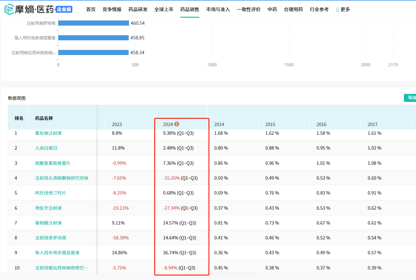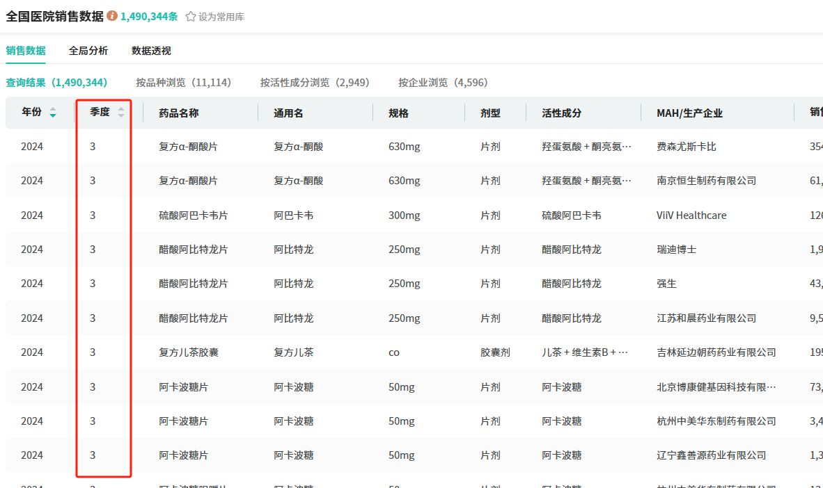 此外,药品分析、企业分析以及ATC分析的详情页,还有同ATC药品竞争分析的数据视图中,增长率的统计维度新增了季度数据,使用户能够更精细地追踪市场变化,及时调整策略。