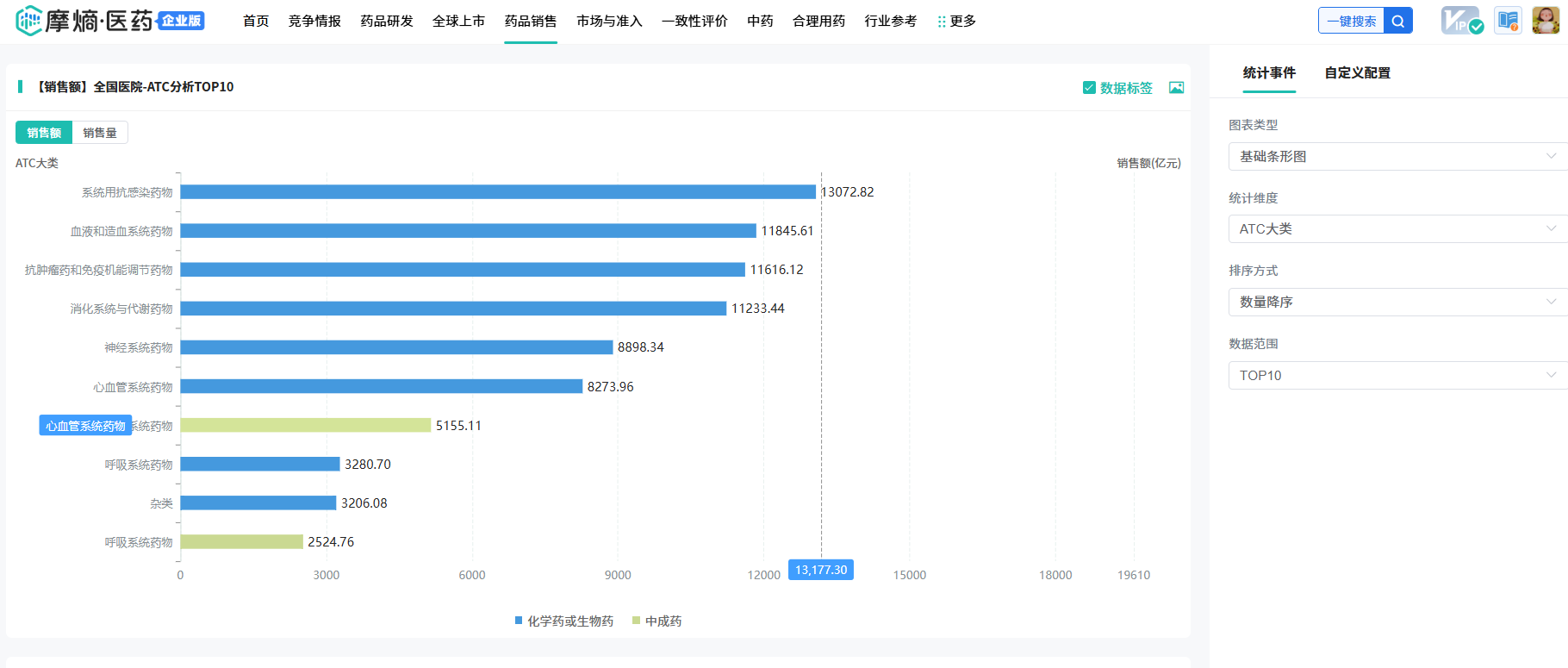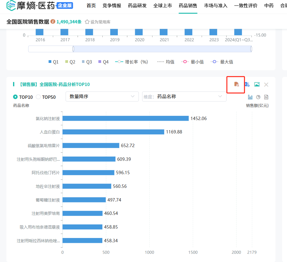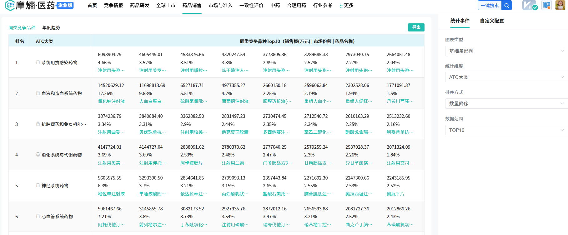 在药品分析详情页的数据视图中,新增了排名、市场份额以及在销企业数的统计信息,为用户提供更丰富的市场洞察。在ATC分析详情页的数据视图中,加入了市场份额、增长率以及年度趋势的统计,帮助用户把握市场动向。
