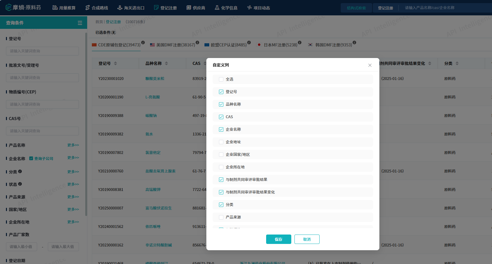 此外,CDE原辅包登记列表新增了多项字段展示,具体包括与制剂共同审评审批的结果变动情况、产品厂家数量以及产品厂家数比例(A/I),为用户提供更全面的信息概览。同时,对数据库的检索功能进行了全面优化,以提升用户的查询效率与体验。
