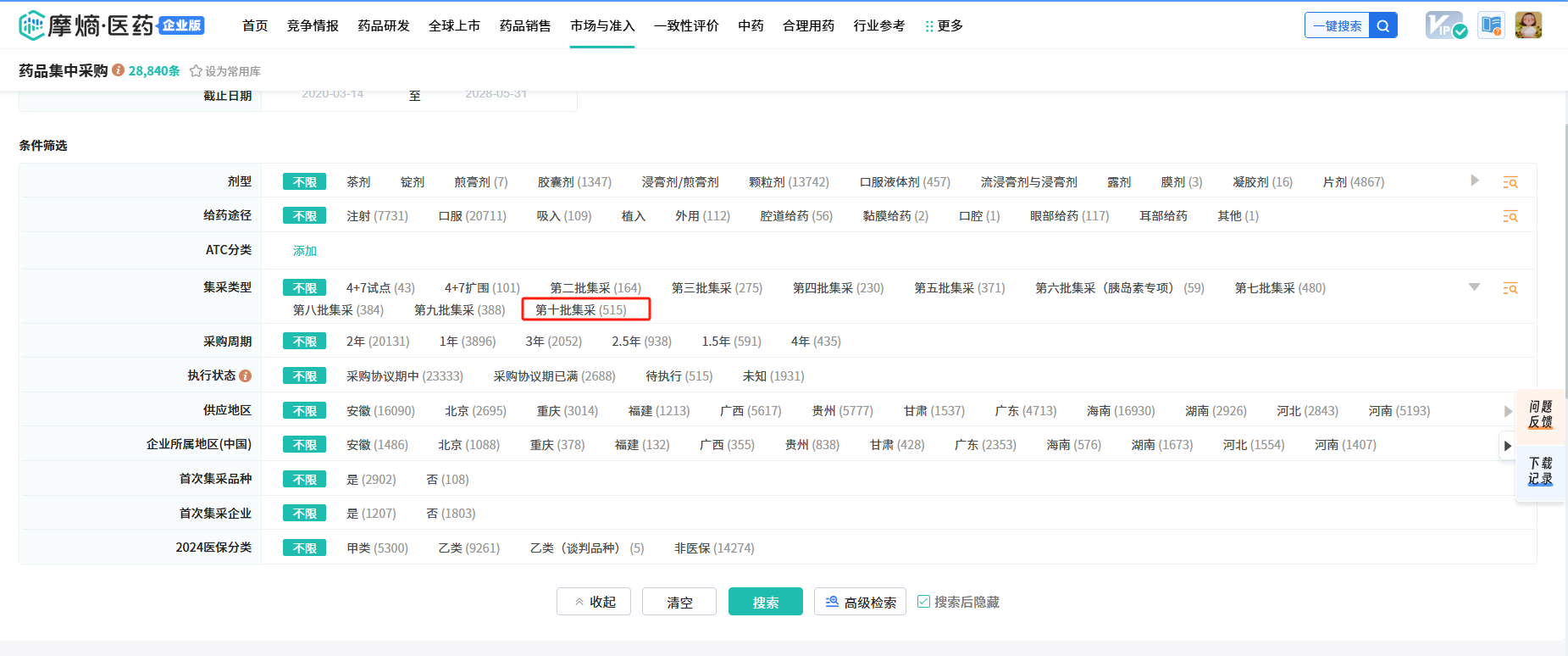 更新了“第十批集采数据”,方便您查看分析第十批国家药品集采的中选结果,包括中选品种、采购量、中选企业、中选价格、剂型分布、治疗领域分布等详细情况。