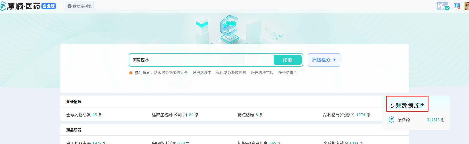 针对首页检索功能,我们上线了一键检索的扩展功能,其搜索结果页面现已纳入“原料药专题数据库”的相关数据查询结果,方便用户在检索时能够直接获取到其原料药领域的详尽数据,极大地便利了用户对原料药相关信息的查询需求,提升了数据检索的全面性。