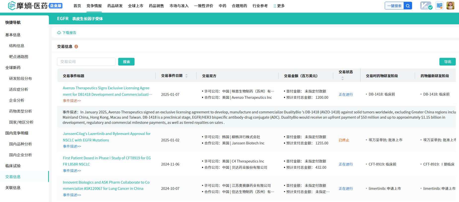 临床试验版块则涵盖了全球临床试验和临床试验结果;交易信息版块全面展现了相关靶点药物的医药交易信息;用户可以通过交易数量,对比靶点之间市场交易的热度,通过分析临床结果,展示靶点之间临床疗效积极性对比。