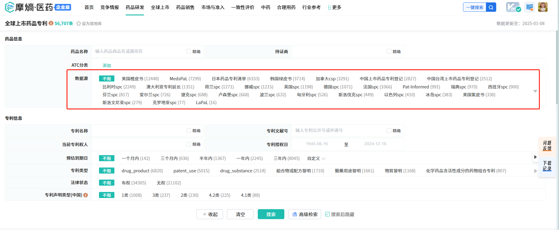 新增十个数据源数据,涵盖了多个国家和地区的专利信息,包括爱尔兰、匈牙利、克罗地亚、斯洛文尼亚、卢森堡及斯洛伐克的SPC数据,以及以色列的药品专利延长信息;同时还加入了Pat-informed、MedspaL和LaPaL等专业数据资源,极大地丰富了数据库的专利信息内容,为用户提供了更全面、更权威的药品专利数据支持。