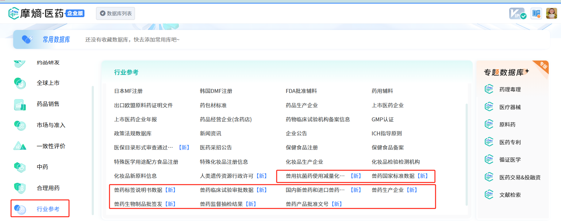 - 新库上线:新增“行业参考”数据库群下的9个兽药相关数据库,包括兽用抗菌药使用减量化达标养殖场等;