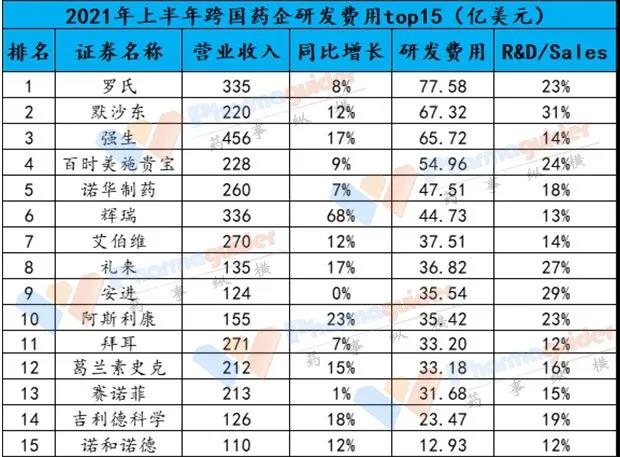 排名第一的是罗氏,上半年研发费用77.58亿美元,同比增长16%;营收为335亿美元,研发费用占营收比例为23%。