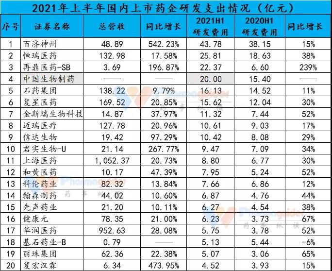 1、从top20来看,大部分药企研发投入和去年同期相比大幅度增加,其中增长超过30%的有12家。其中再鼎医药今年上半年研发投入22亿元,同比大增2倍多。和黄医药、华润医药、健康元和丽珠集团上半年研发投入同比增长超过50%;