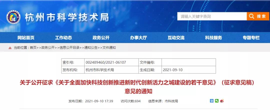 导读:近期,杭州市科学技术局公开征求《关于全面加快科技创新推进新时代创新活力之城建设的若干意见》(征求意见稿)意见,其中大力: