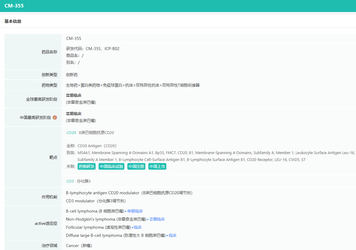 CM355(ICP-B02)是康诺亚和诺诚健华联合开发的双特异性抗体。目前正在中国开展 I/II 期临床试验,旨在评估CM355(ICP-B02)在复发/难治性非霍奇金淋巴瘤(NHL)患者中的安全性、耐受性、药代动力学(PK)以及抗肿瘤活性。