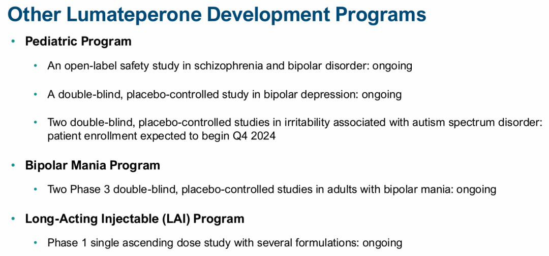 2024年底,Intra-Cellular向美国FDA提交了Lumateperone的第3项新适应症上市申请(sNDA),用于重度抑郁症(MDD)的辅助治疗。产品生命周期管理方面,本品的长效注射剂型(LAI)也在同步开发中。